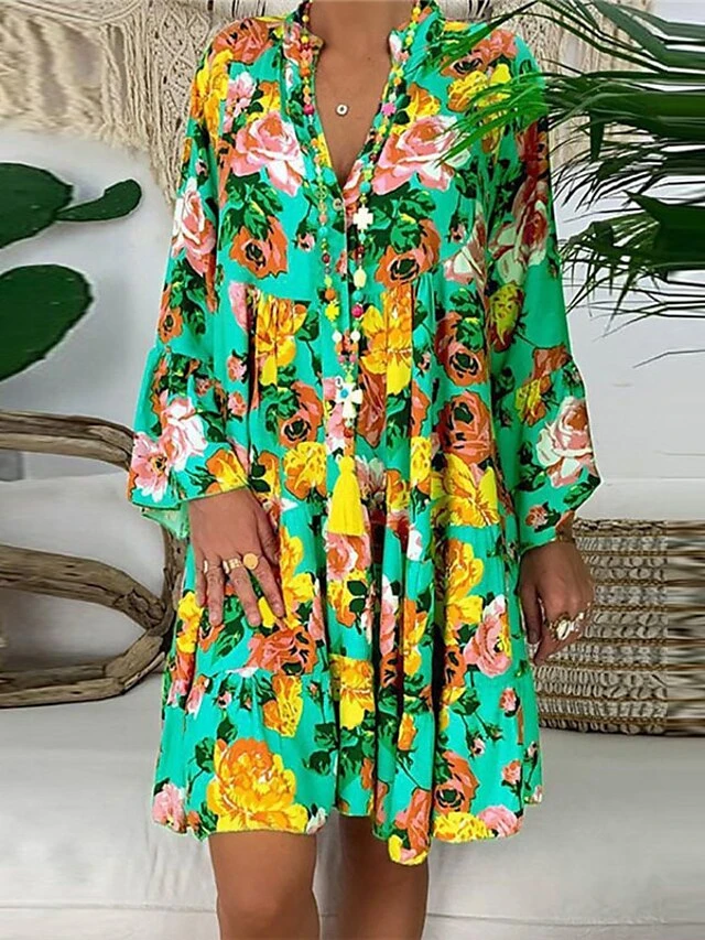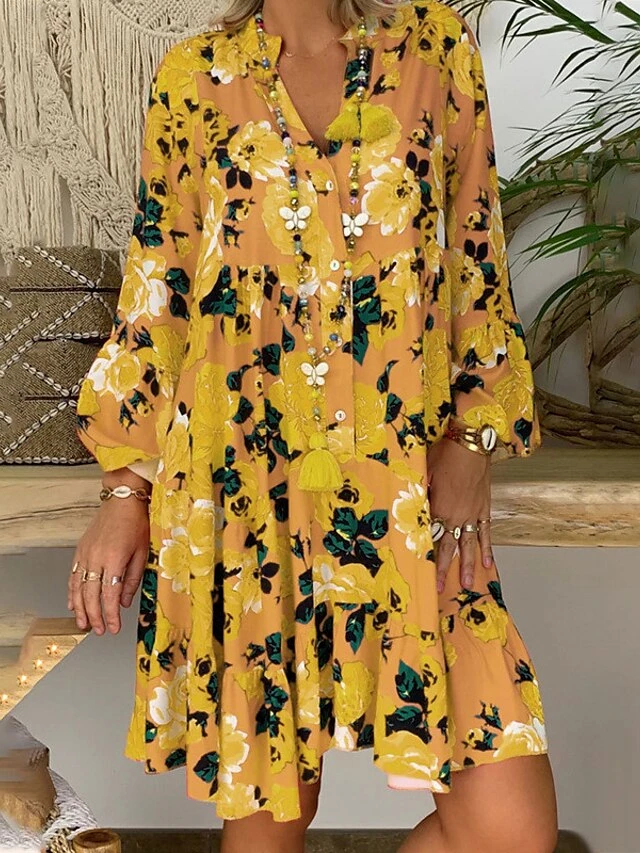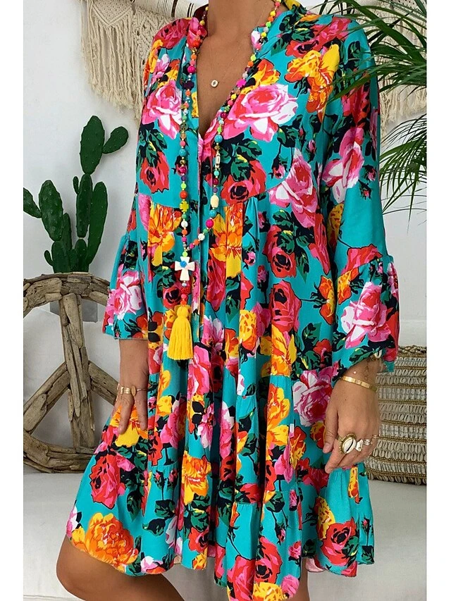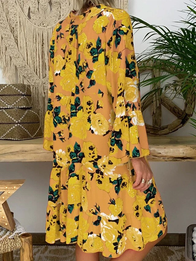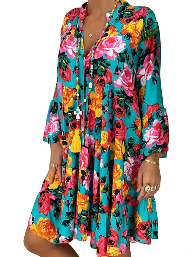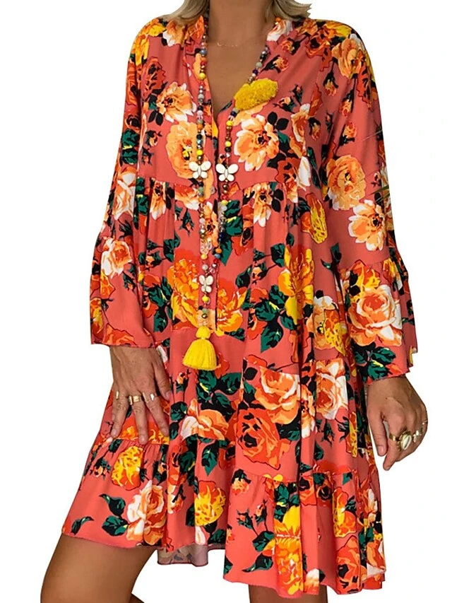 Women‘s Plus Size Curve Casual Dress Floral V Neck Print Long Sleeve Fall Spring Casual Short Mini Dress Daily Vacation Dress