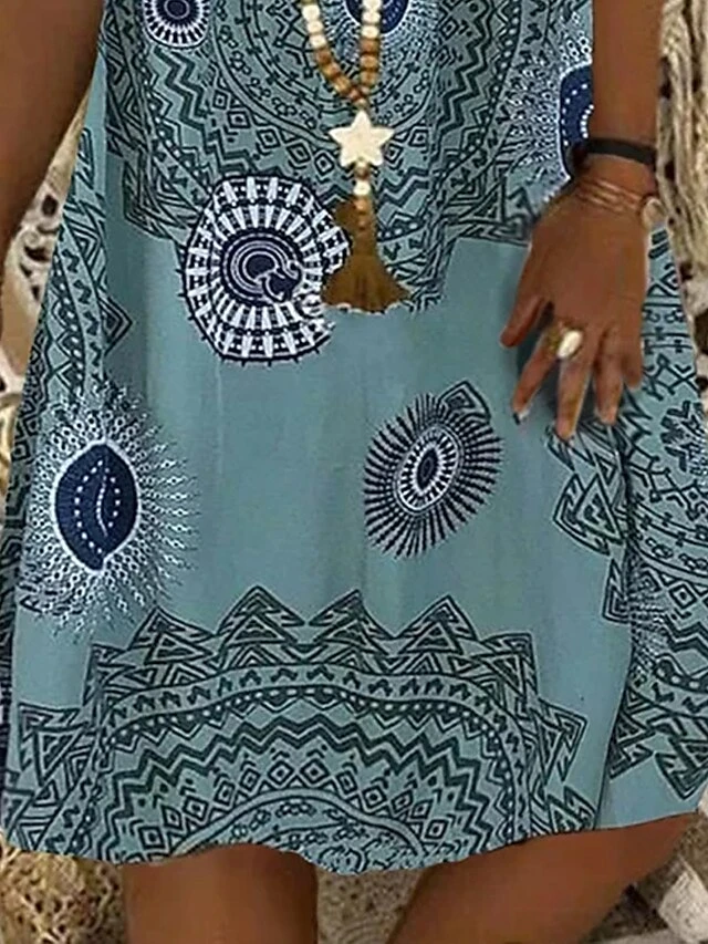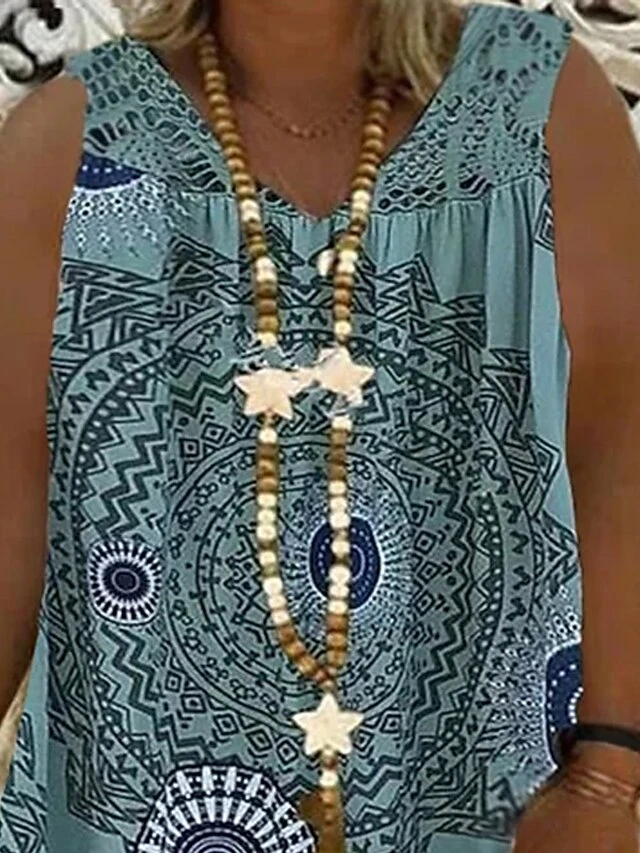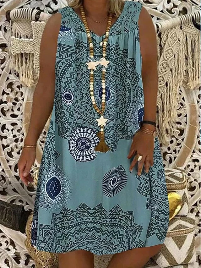 Women‘s Plus Size Curve Casual Dress Shift Dress Geometric Midi Dress Sleeveless Print V Neck Basic Daily Blue Summer Spring L XL XXL 3XL 4XL