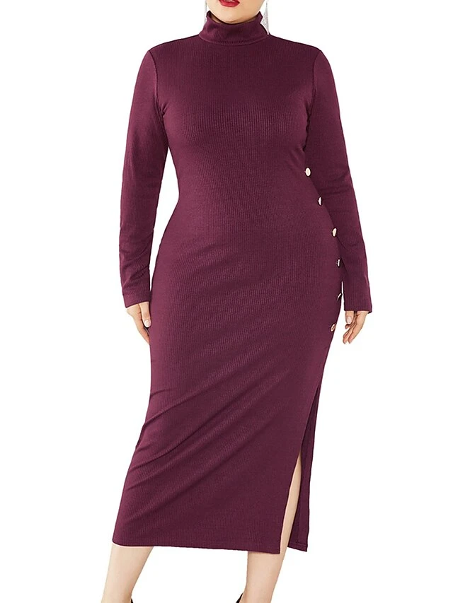 Women’s Plus Size Curve Casual Dress Sweater Dress Sheath Dress Plain Midi Dress Long Sleeve Button Split Stand Collar Fashion Daily Black Wine Fall Winter XL XXL 3XL 4XL 5XL
