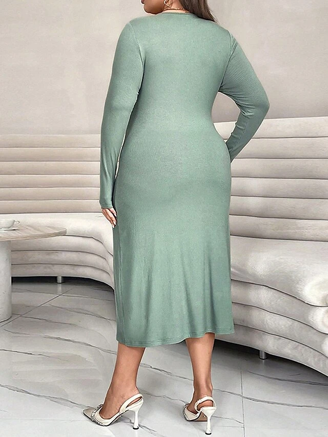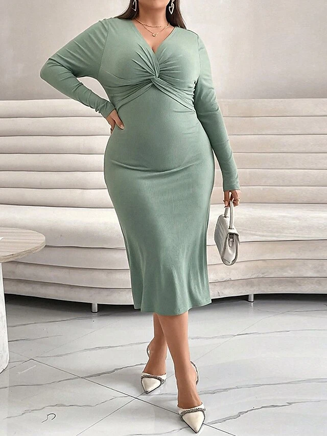Women’s Plus Size Curve Casual Dress Winter Dress Bodycon Solid Color Midi Dress Long Sleeve Ruched V Neck Fashion Outdoor Green Fall Winter XL XXL 3XL