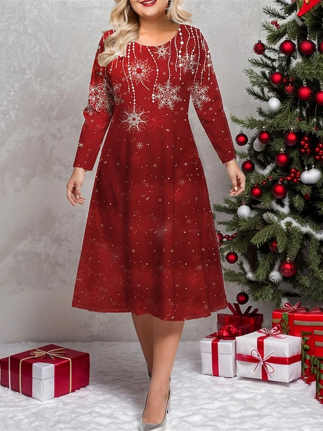 Women’s Plus Size Curve Casual Dress Winter Dress Skater Dress Snowflake Midi Dress Long Sleeve Print Crew Neck Fashion Outdoor White Wine Fall Winter L XL XXL 3XL 4XL