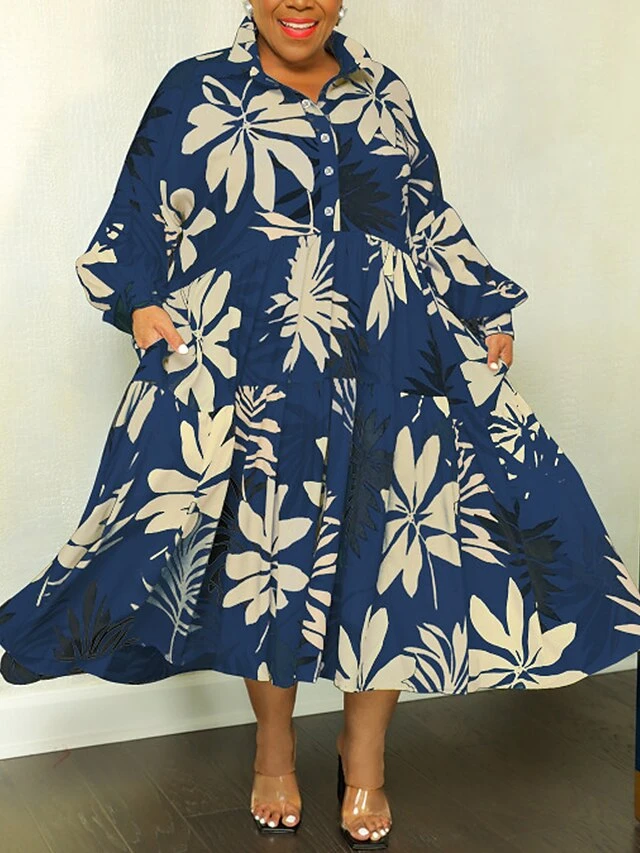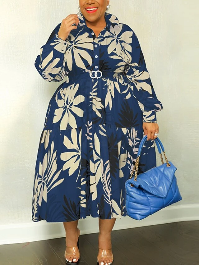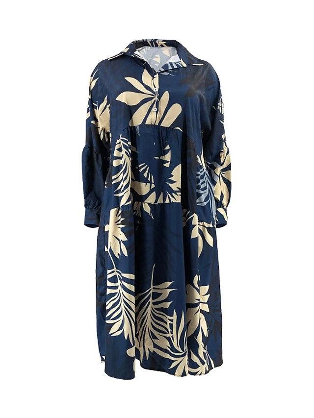 Women‘s Plus Size Curve Denim Dress Casual Dress Swing Dress Leaf Midi Dress Long Sleeve Button Print Shirt Collar Fashion Daily White Blue Fall Spring XL XXL 3XL 4XL 5XL