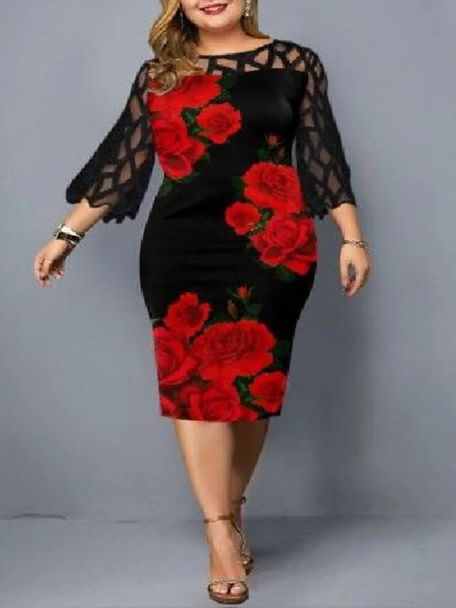 Women‘s Plus Size Curve Flattering Dresses Elegant Apple Shaped Dress Wedding Guest Party Dress Print Crew Neck Sleeve Spring Fall Work Casual Prom Dress Midi Dress Daily Work Dress