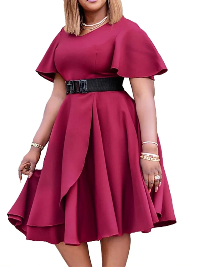 Women‘s Plus Size Curve Flattering Dresses Elegant Apple Shaped Dress Wedding Guest Work Dress Pure Color V Neck Ruffle Short Sleeve Spring Fall Work Knee Length Dress Going Out Work Dress