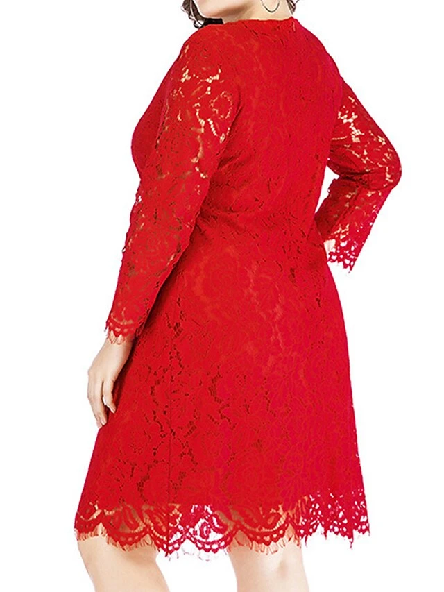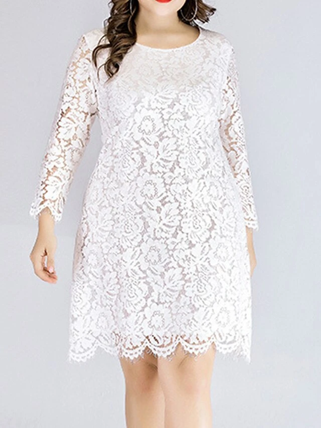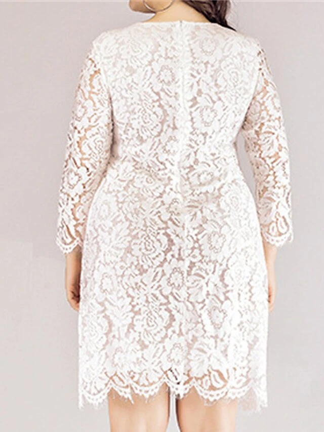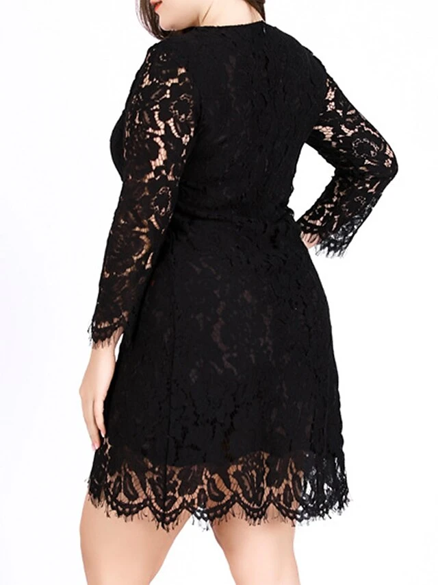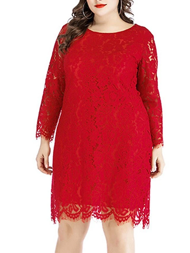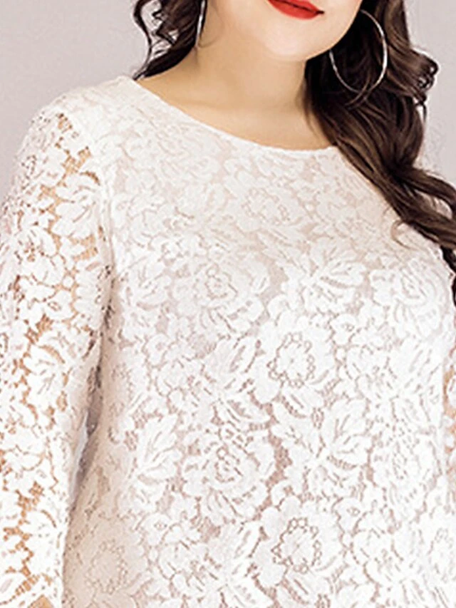 Women‘s Plus Size Curve Lace Dress Work Dress A Line Dress Solid Color Midi Dress Long Sleeve Lace Crew Neck Fashion Office Black White Spring Fall L XL XXL 3XL 4XL