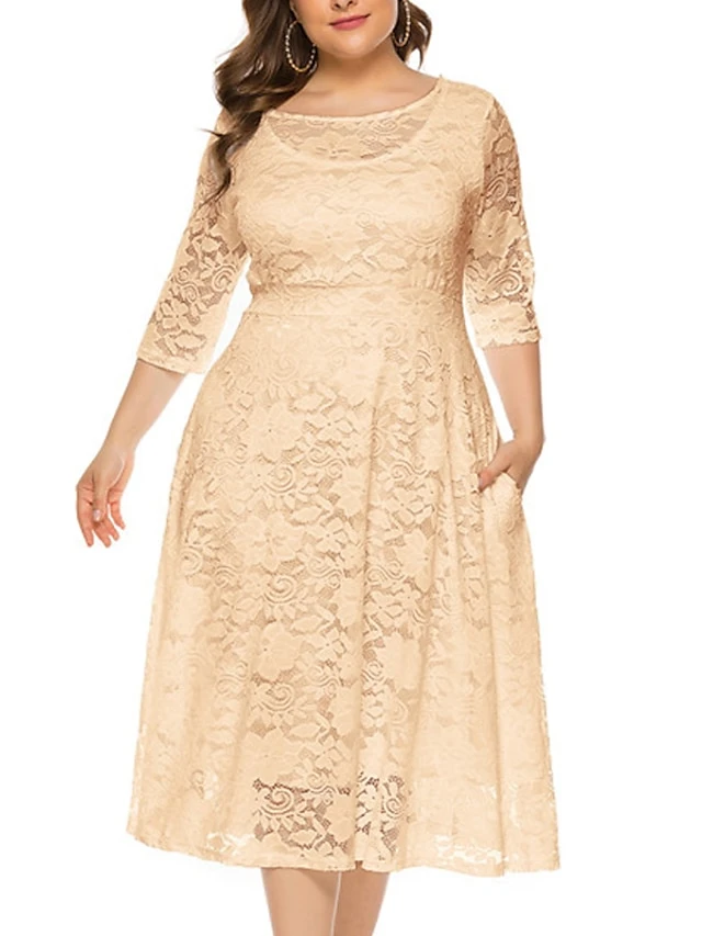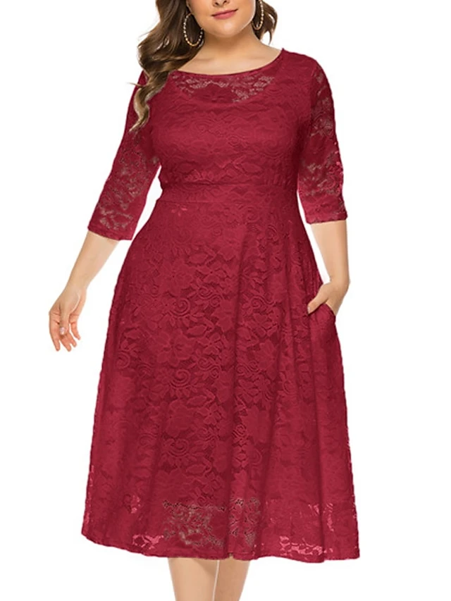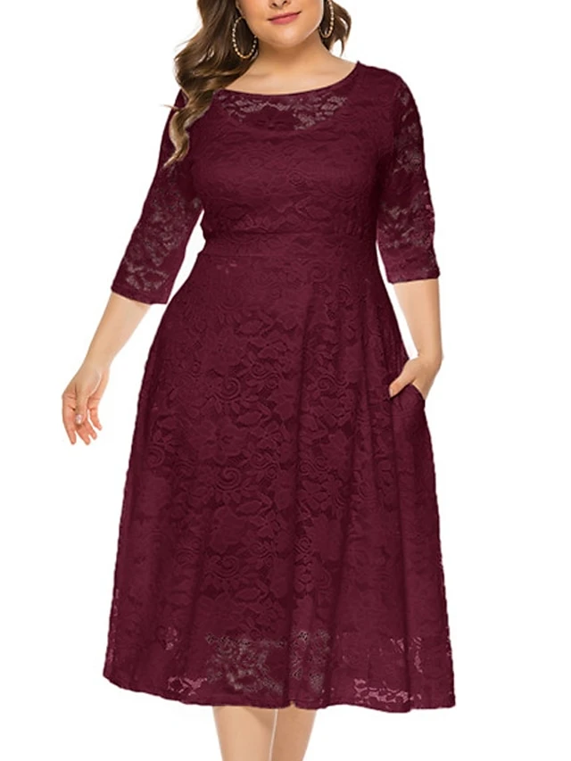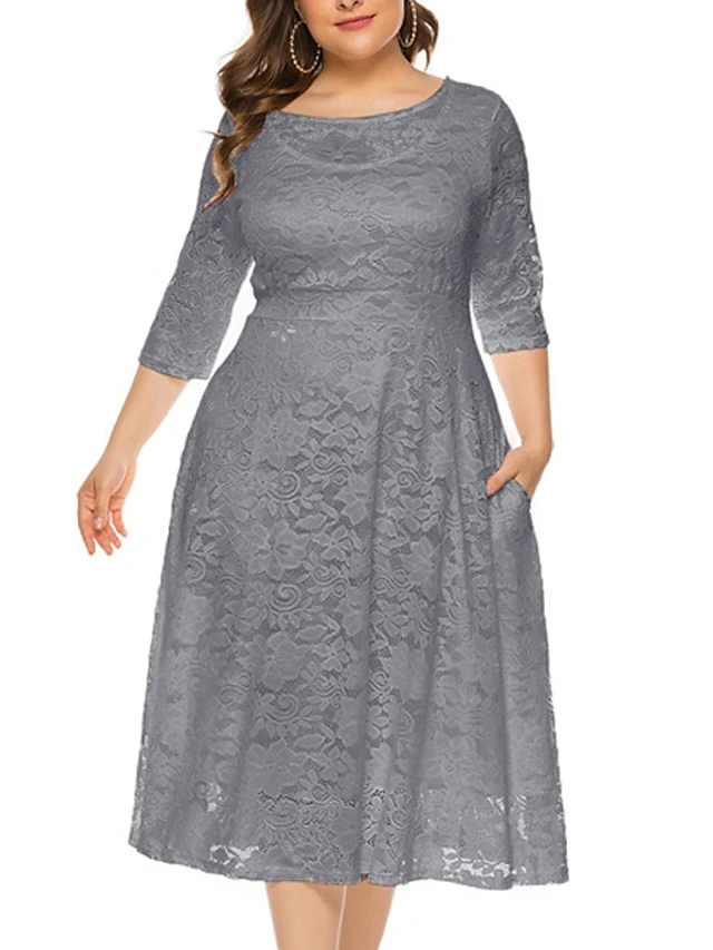 Women‘s Plus Size Curve Party Dress Black Dress Floral Crew Neck Lace 3/4 Length Sleeve Spring Fall Work Prom Dress Midi Dress Party