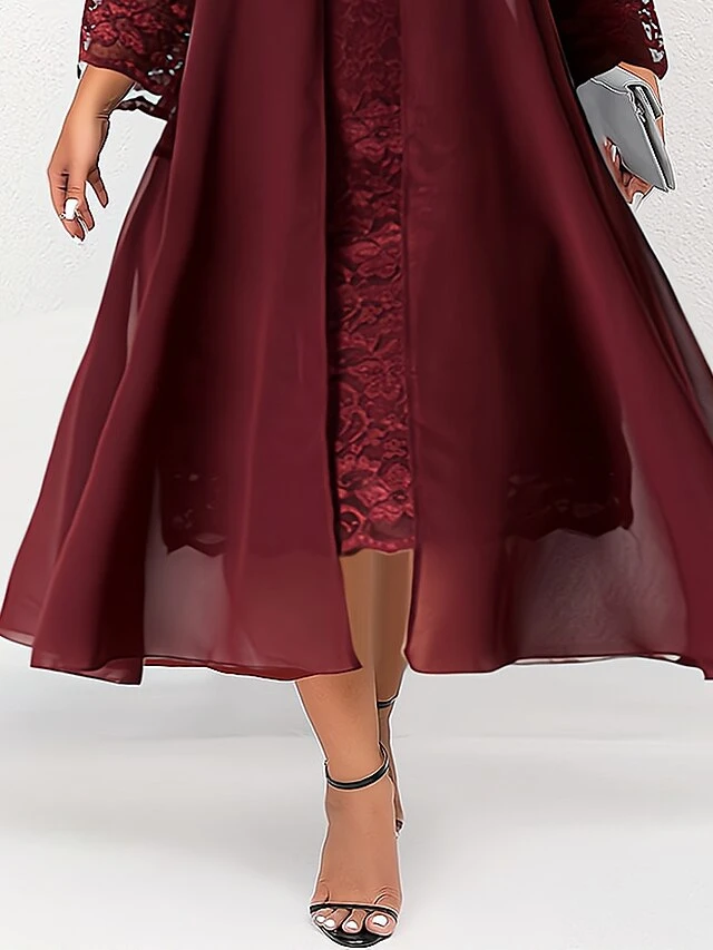 Women’s Plus Size Curve Party Dress Casual Dress Lace Dress Plain Midi Dress Long Sleeve Lace Patchwork Crew Neck Fashion Party Black Wine Fall Winter L XL XXL 3XL 4XL