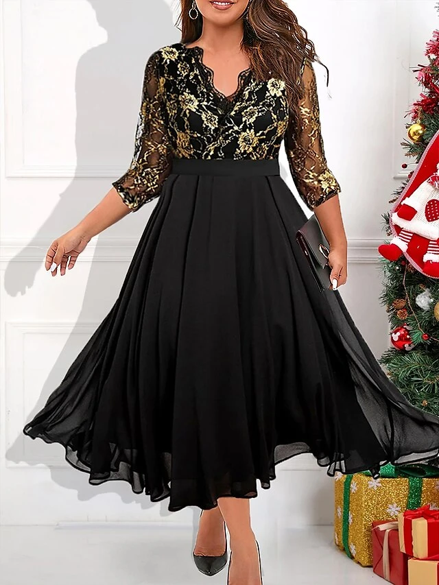 Women’s Plus Size Curve Party Dress Chiffon Dress Swing Dress Floral Long Dress Maxi Dress 3/4 Length Sleeve Mesh Patchwork V Neck Fashion Party Black Fall Winter L XL XXL 3XL 4XL