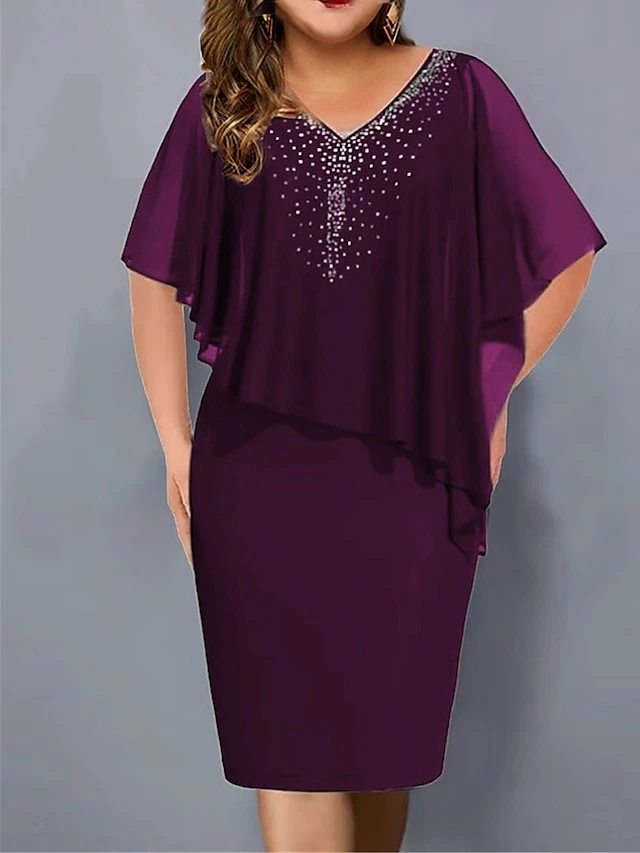 Women‘s Plus Size Curve Party Dress Cocktail Dress Wedding Guest Dress Midi Dress Black Wine Navy Blue Half Sleeve Pure Color Patchwork Summer Spring Fall V Neck Fashion Vacation