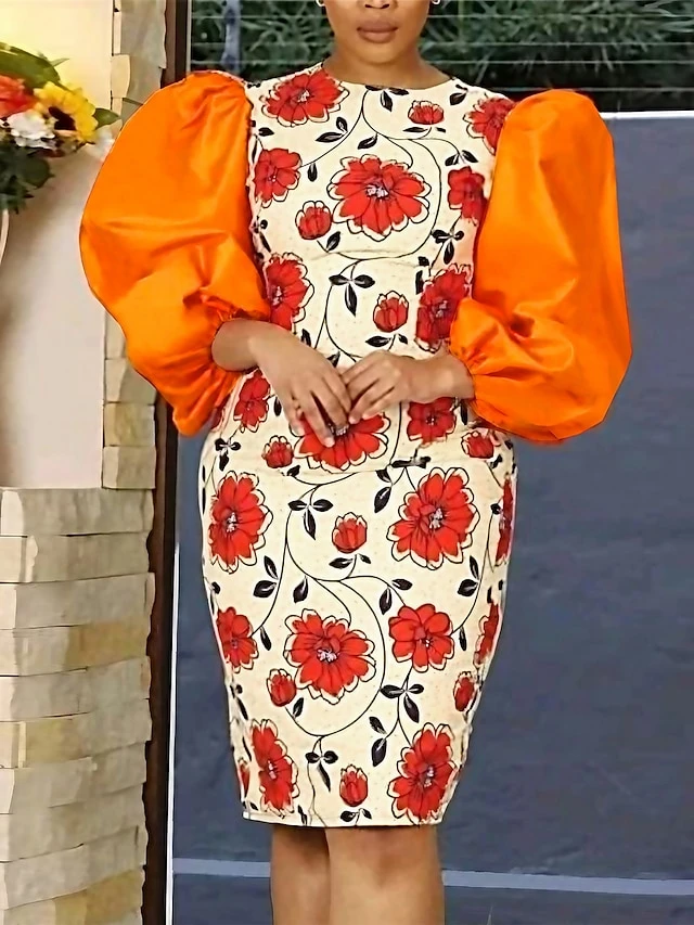 Women‘s Plus Size Curve Party Dress Cocktail Dress Wedding Guest Dress Midi Dress Orange 3/4 Length Sleeve Floral Print Spring Fall Winter Crew Neck Fashion Winter Dress Wedding Guest Vacation 2023