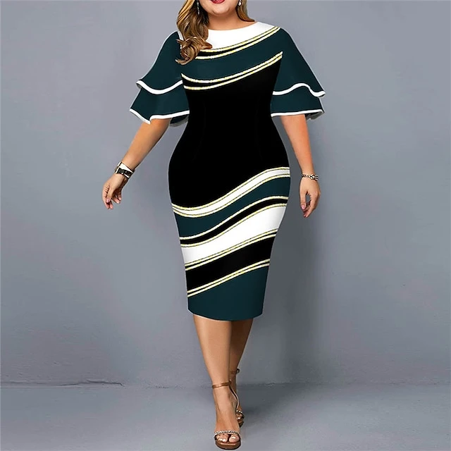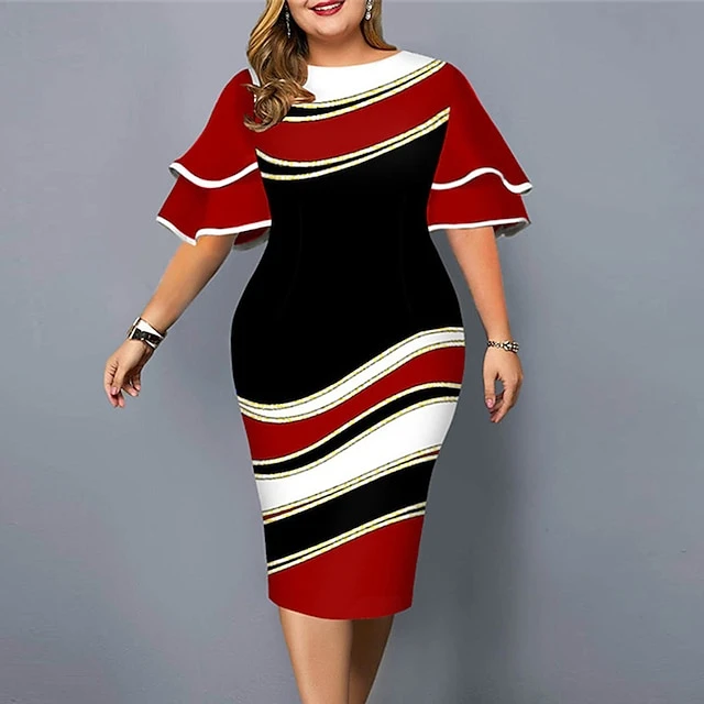 Women‘s Plus Size Curve Party Dress Color Block Crew Neck Print Short Sleeve Spring Fall Work Casual Prom Dress Knee Length Dress Casual Daily DressHomecoming Dress