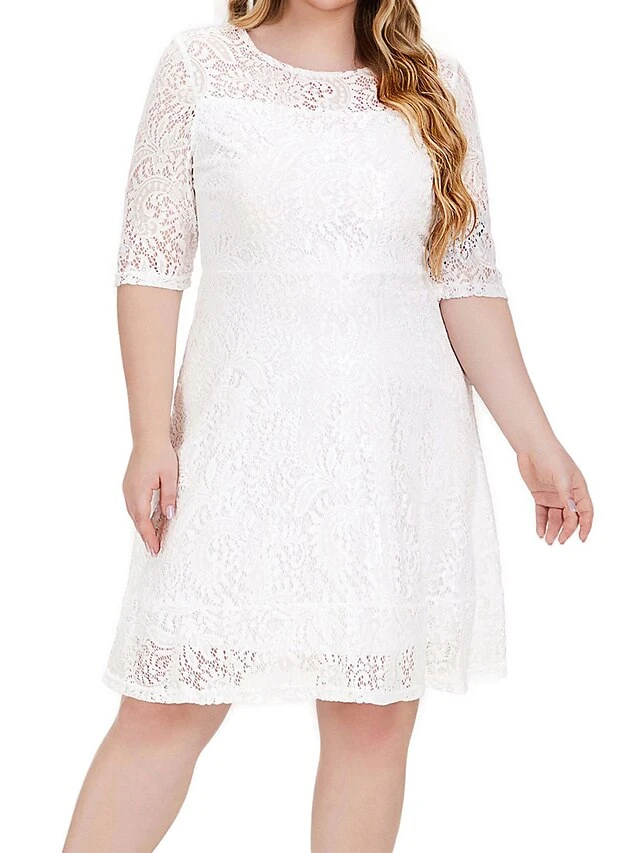 Women’s Plus Size Curve Party Dress Lace Dress Sheath Dress Solid Color Midi Dress 3/4 Length Sleeve Lace Crew Neck Fashion Wedding Black White Spring Fall XL XXL 3XL 4XL 5XL