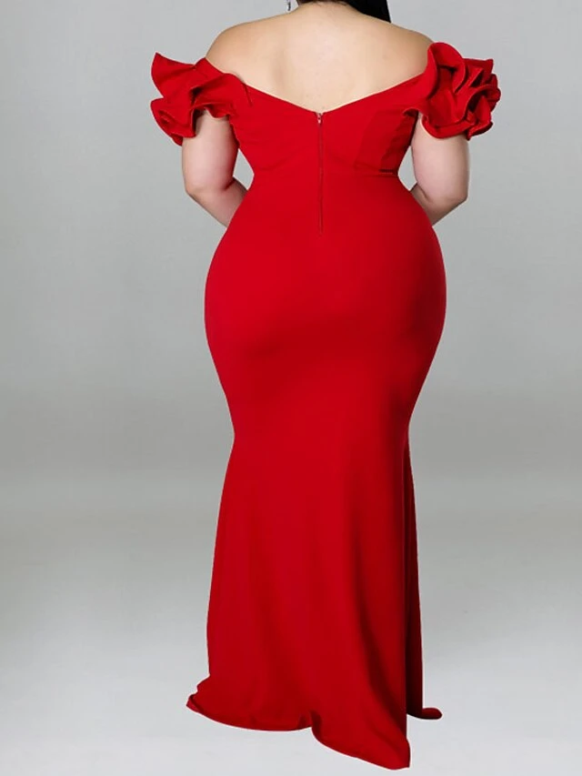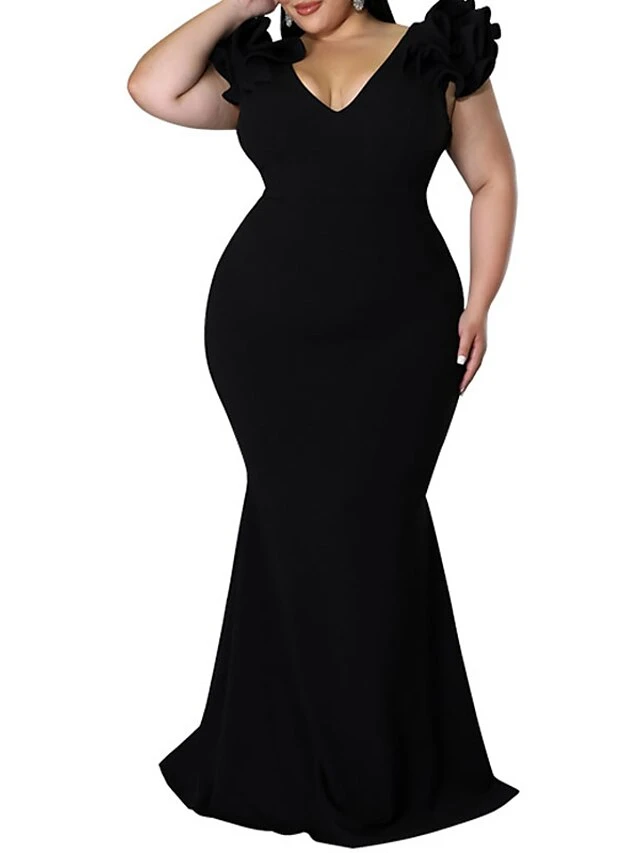 Women‘s Plus Size Curve Party Dress Solid Color V Neck Ruffle Short Sleeve Spring Summer Prom Dress Maxi Long Dress Party Back To School Dress Homecoming Dress