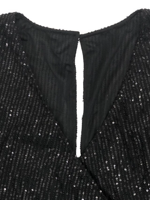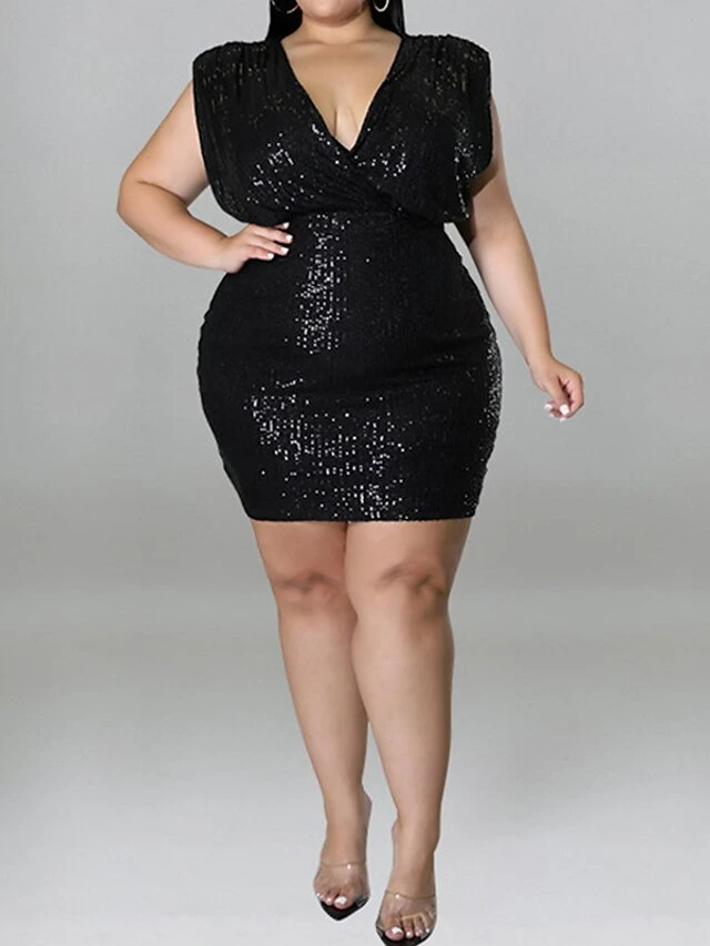 Women‘s Plus Size Curve Party Dress Solid Color V Neck Sequins Short Sleeve Spring Summer Sequins Prom Dress Short Mini Dress Party Back To School Dress Sequin Dress Homecoming Dress
