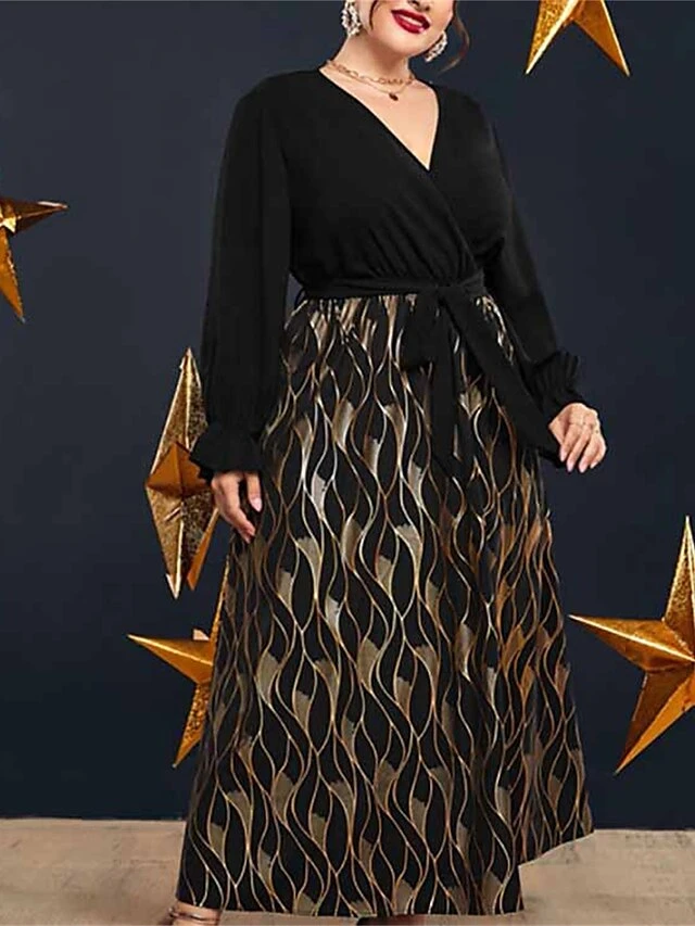 Women’s Plus Size Curve Prom Dress Party Dress Wedding Guest Dress Long Dress Maxi Dress Black Long Sleeve Print Lace Up Fall Winter Autumn V Neck Fashion Evening Party Wedding Guest L XL
