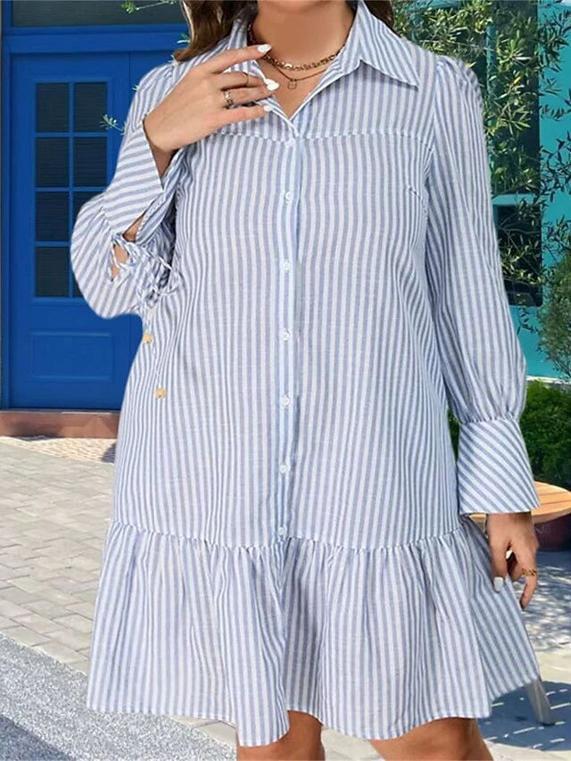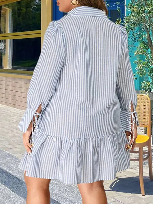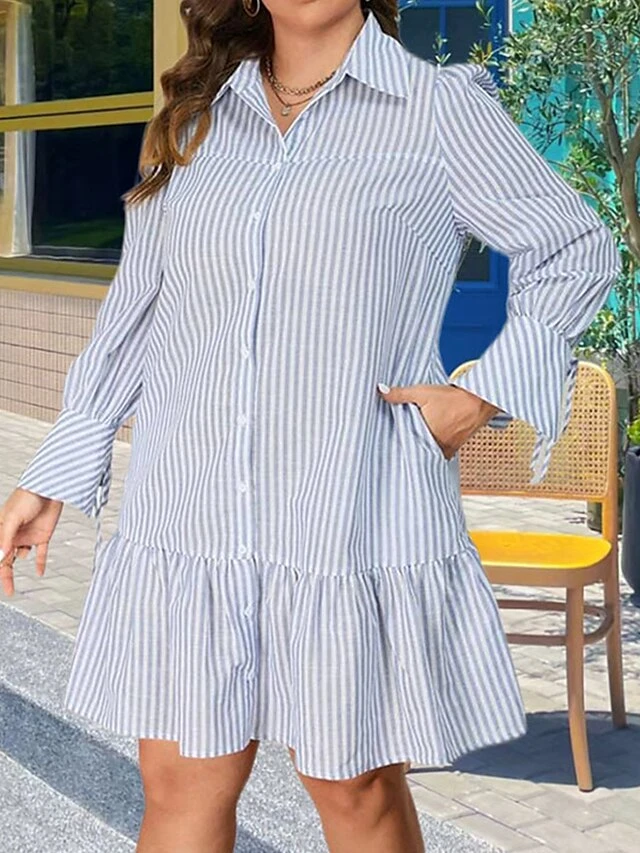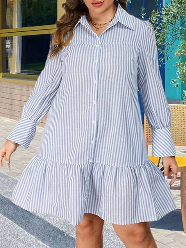Women’s Plus Size Curve Shirt Dress Casual Dress Stripe Midi Dress Long Sleeve Ruffle Button Shirt Collar Fashion Outdoor Light Blue Fall Winter XL XXL 3XL 4XL