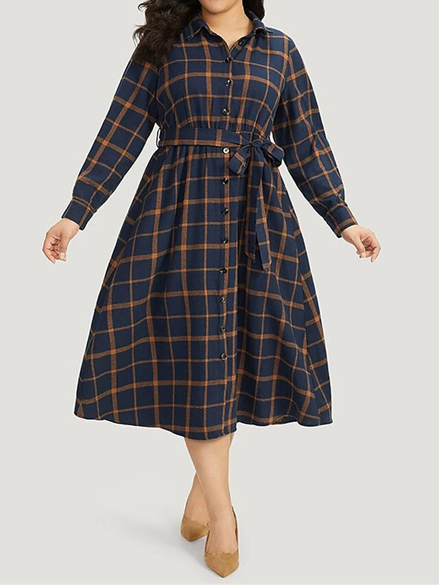 Women’s Plus Size Curve Shirt Dress Casual Dress Swing Dress Plaid Midi Dress Long Sleeve Lace Up Button Shirt Collar Fashion Outdoor Dark Blue Fall Winter L XL 2XL 3XL 4XL