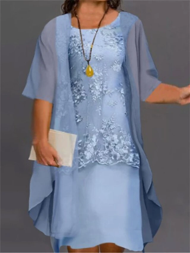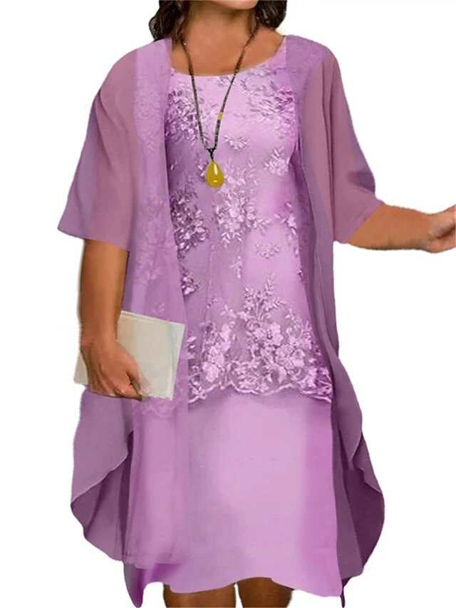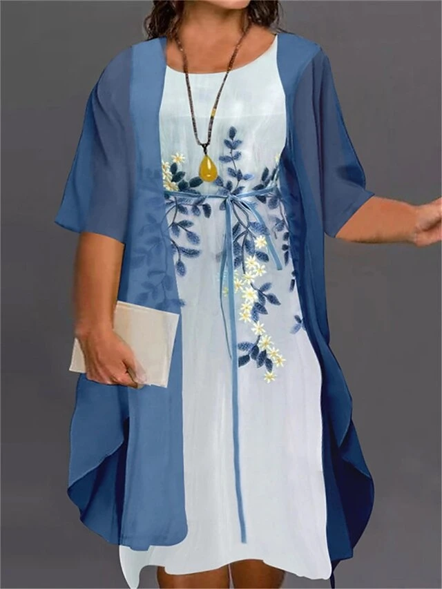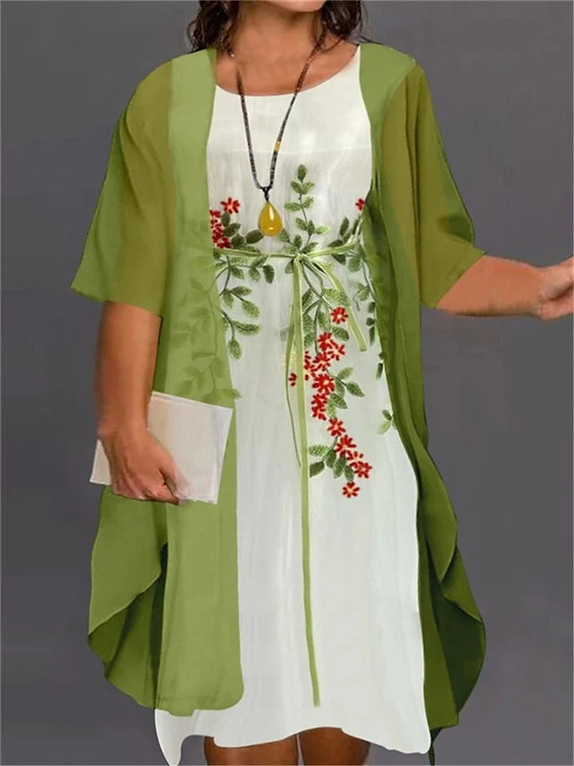 Women‘s Plus Size Curve Two Piece Dress Floral Crew Neck Print Half Sleeve Fall Spring Work Casual Knee Length Dress Casual Daily Dress