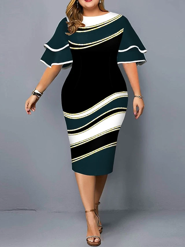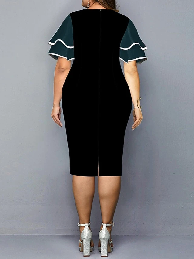Women‘s Plus Size Curve Work Dress Bodycon Sheath Dress Color Block Midi Dress Half Sleeve Ruffle Crew Neck Fashion Outdoor Wine Red Fall Spring XL XXL 3XL 4XL 5XL