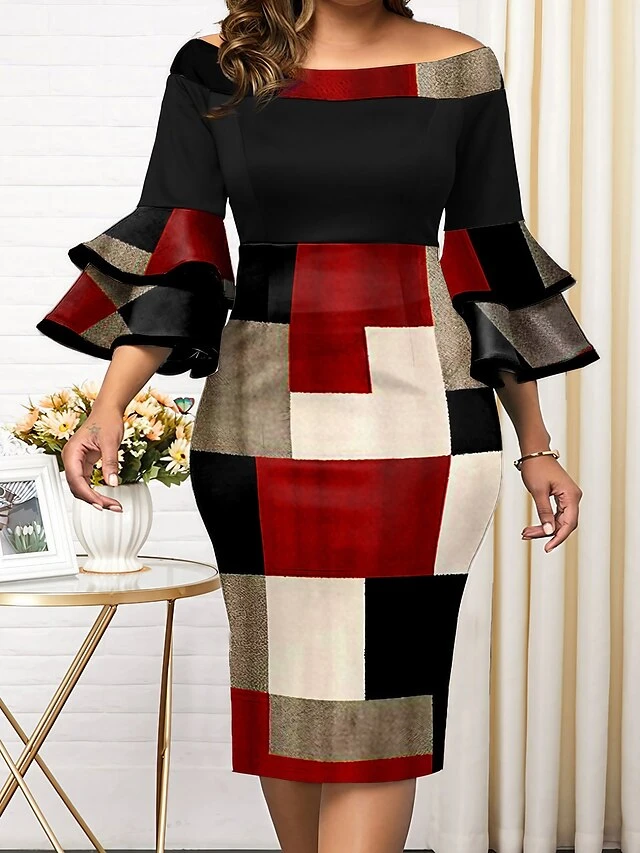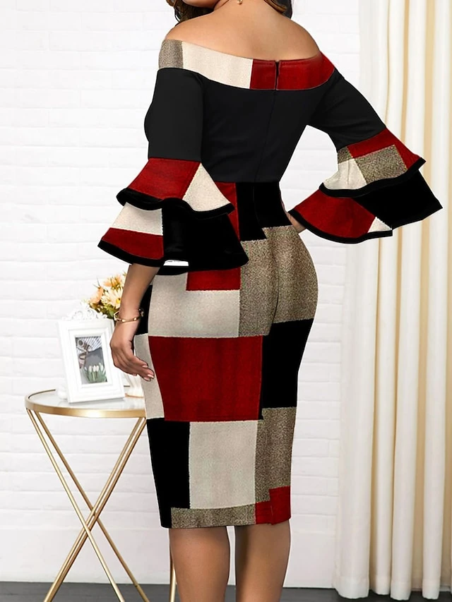 Women‘s Plus Size Curve Work Dress Bodycon Sheath Dress Plaid Midi Dress 3/4 Length Sleeve Backless Crew Neck Fashion Office Red Fall Spring XL XXL 3XL 4XL 5XL