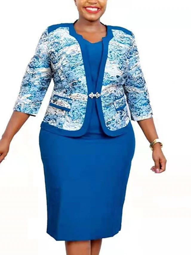 Women‘s Plus Size Curve Work Dress Leaf Crew Neck 3/4 Length Sleeve Spring Fall Stylish Work Knee Length Dress Vacation Going Out Dress