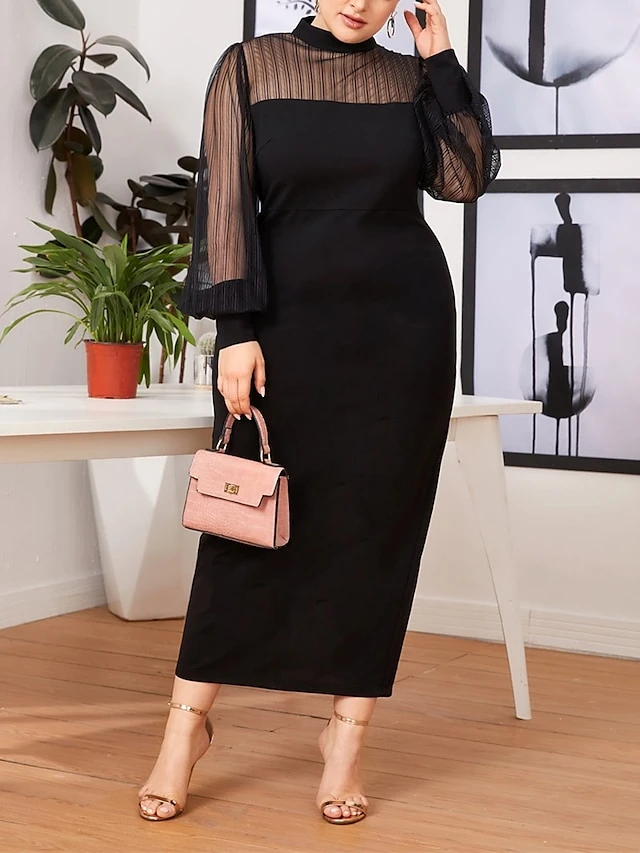 Women‘s Plus Size Curve Work Dress Sheath Dress Black Dress Fashion Mesh Sleeve Long Dress Maxi Dress Mesh Stand Collar Long Sleeve Plain Regular Fit Black Spring Fall L XL XXL 3XL 4XL