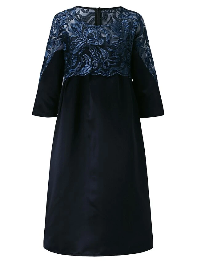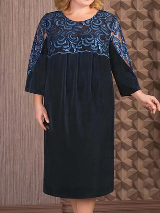 Women‘s Plus Size Curve Work Dress Shift Dress Leaf Color Block Midi Dress 3/4 Length Sleeve Lace Crew Neck Fashion Office Dark Blue Summer Spring L XL XXL 3XL 4XL