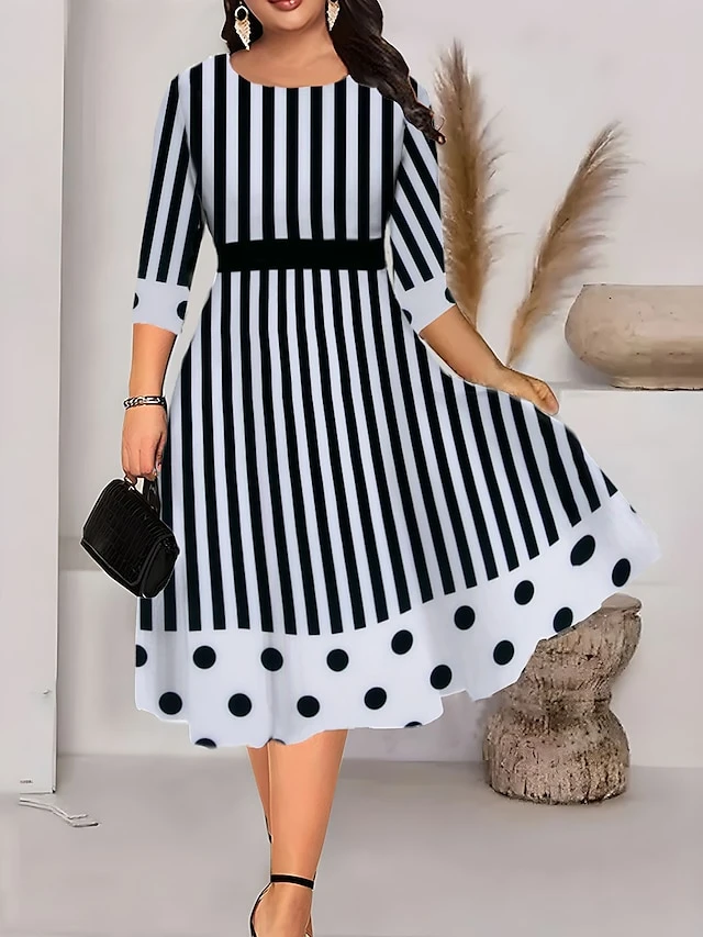 Women‘s Plus Size Curve Work Dress Swing Dress A Line Dress Fashion Midi Dress Print Crew Neck 3/4 Length Sleeve Floral Geometric Regular Fit Black White Green Summer Fall L XL XXL 3XL 4XL