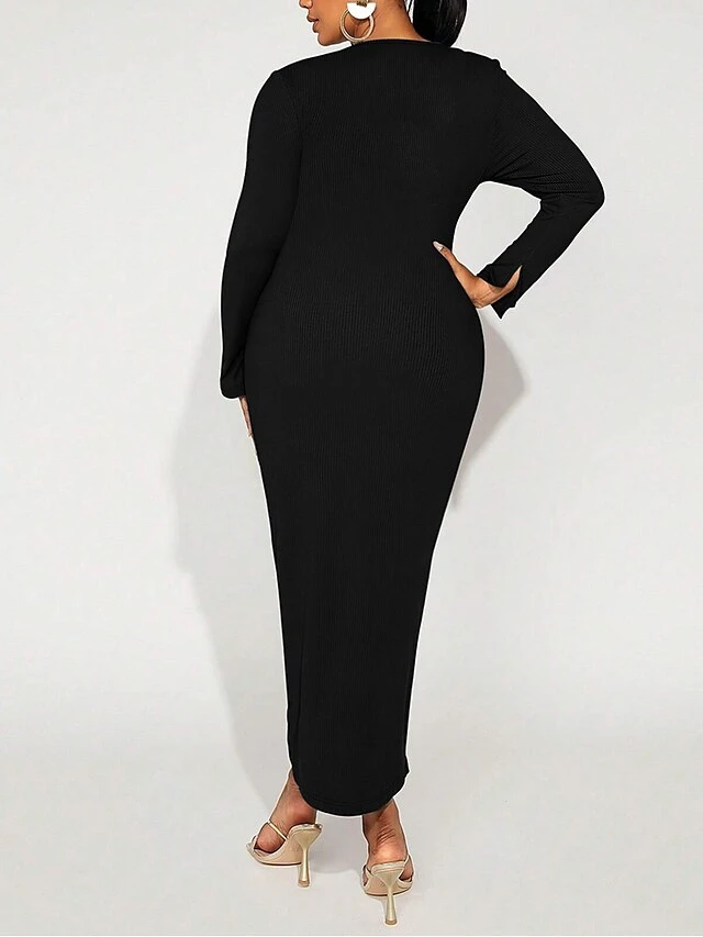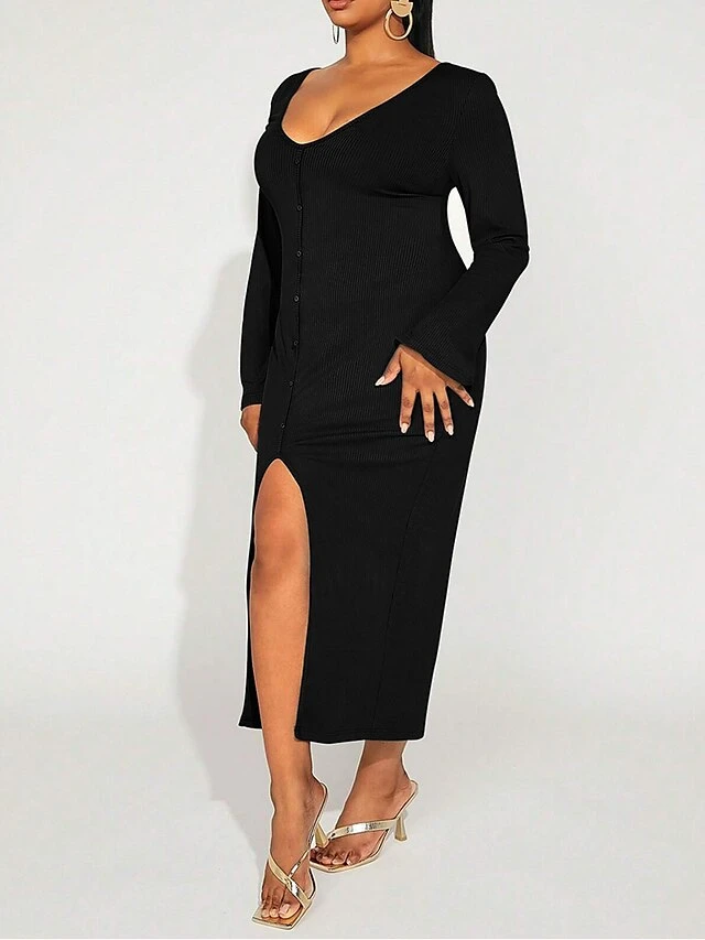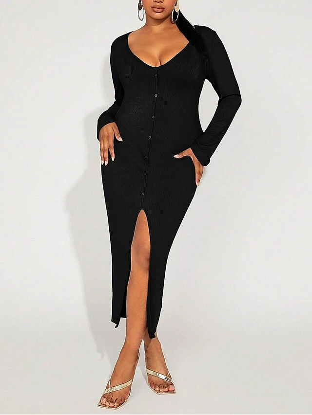 Women’s Plus Size Party Dress Cocktail Dress Bodycon Midi Dress Black Long Sleeve Pure Color Split Fall Winter Autumn V Neck Fashion Winter Dress Vacation Fall Dress 2023 XL XXL 3XL