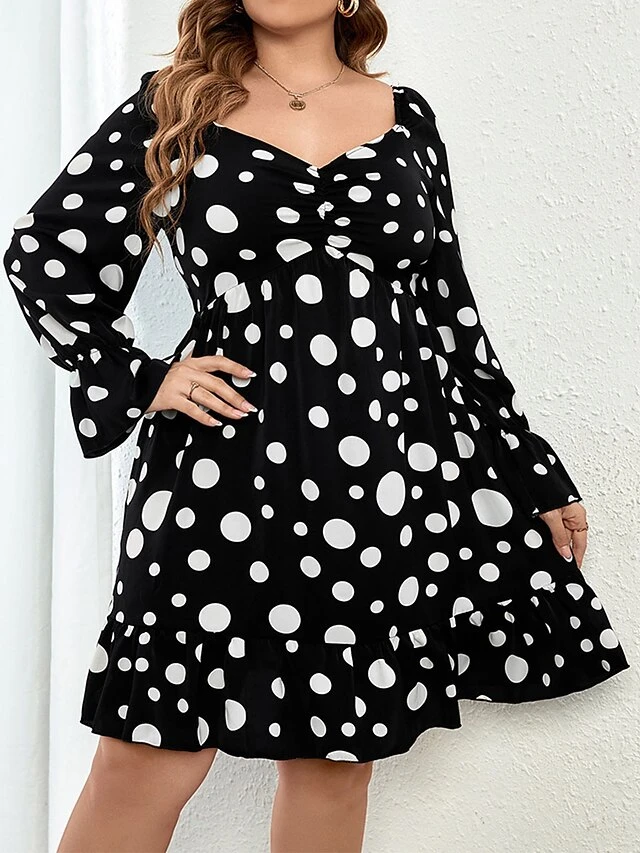 Women’s Plus Size Party Dress Wedding Guest Dress Black Dress Mini Dress Black Long Sleeve Polka Dot Ruffle Spring Fall Winter V Neck Fashion Winter Dress Evening Party Wedding Guest 2023 XL XXL 3XL
