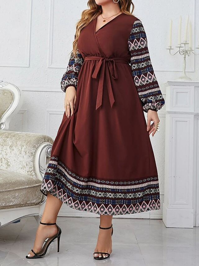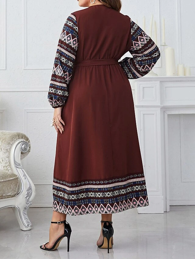Women’s Plus Size Party Dress Wedding Guest Dress Empire Waist Dresses Long Dress Maxi Dress Brown Long Sleeve Geometric Patchwork Spring Fall Winter V Neck Fashion Winter Dress Evening Party Wedding