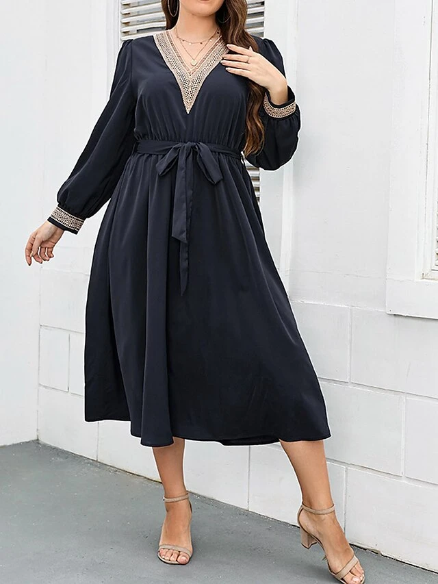 Women’s Plus Size Party Dress Wedding Guest Dress Empire Waist Dresses Midi Dress Dark Blue Long Sleeve Pure Color Patchwork Spring Fall Winter V Neck Fashion Winter Dress Evening Party Wedding Guest