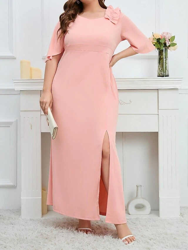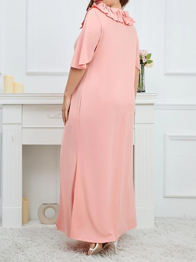 Women’s Plus Size Party Dress Wedding Guest Dress Formal Dress Long Dress Maxi Dress Pink Half Sleeve Pure Color Ruffle Spring Fall Winter V Neck Fashion Birthday Evening Party Wedding Guest 2023 L