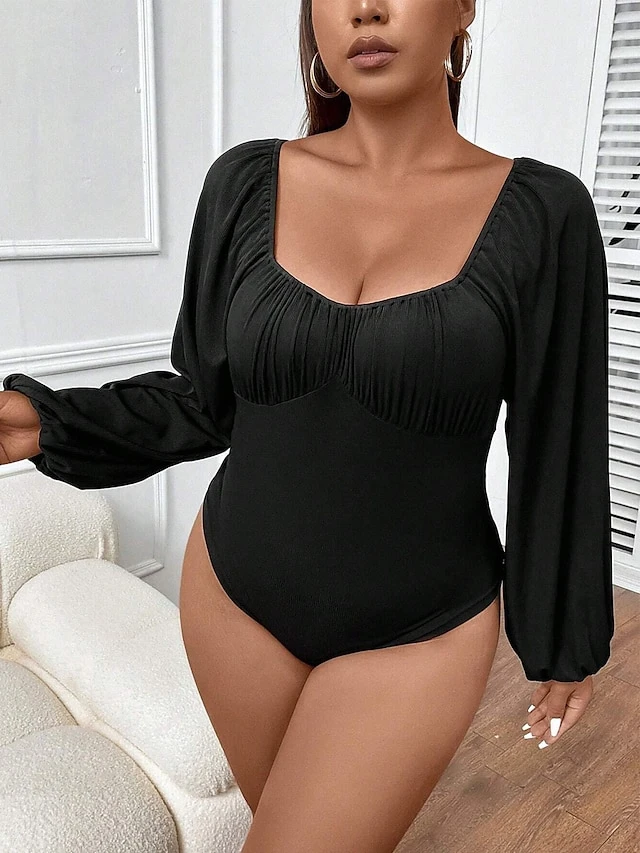 Women’s Plus Size Romper Curve Solid Color Square Neck Bodycon Daily Vacation Regular Fit Long Sleeve Black XL XXL 3XL Fall