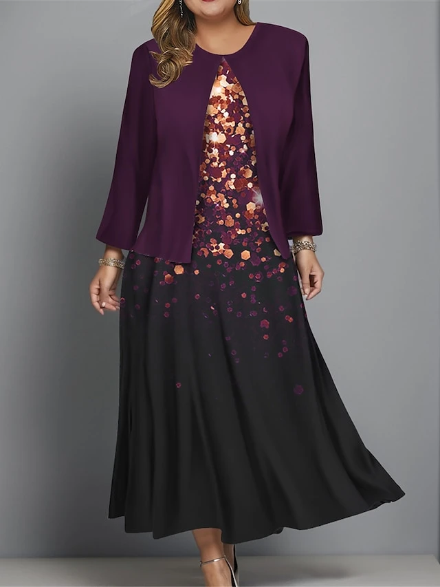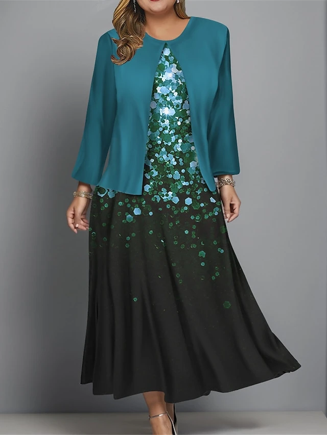 Women’s Plus Size Two Piece Dress Set Casual Dress Swing Dress Outdoor Office Fashion Streetwear Print Midi Dress Crew Neck Long Sleeve Ombre Regular Fit Wine Navy Blue Blue Fall Winter L XL XXL 3XL