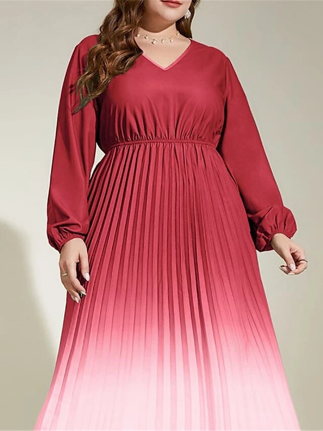 Women’s Plus Size Work Dress Swing Dress Semi Formal Dress Fashion Long Dress Maxi Dress Pleated Print V Neck Long Sleeve Ombre Regular Fit Red Fall Winter L XL XXL 3XL 4XL