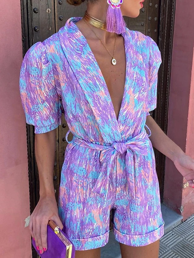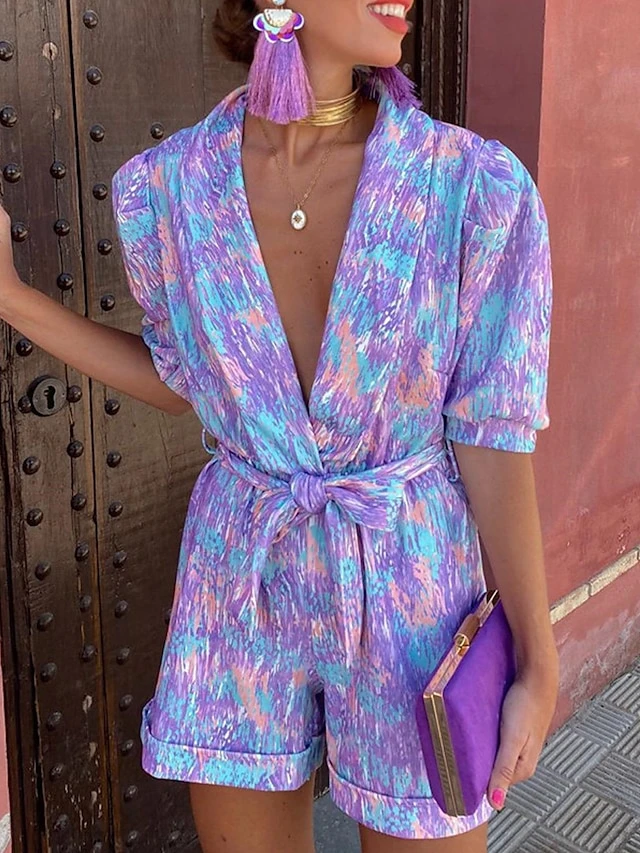 Women’s Romper Lace Up Pocket Print V Neck Streetwear Street Daily Regular Fit Half Sleeve Red Purple S M L Summer