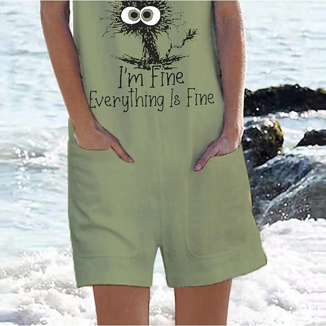 Women’s Romper Patch Pocket Letter U Neck Casual Holiday Weekend Straight Regular Fit Strap Green White S M L Spring