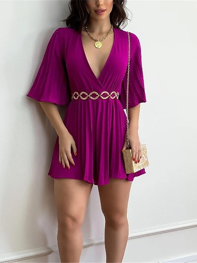 Women’s Romper Pleated Solid Color V Neck Streetwear Street Xmas Daily Party Christmas Regular Fit 3/4 Length Sleeve Light Green Pink Fuchsia S M L Summer