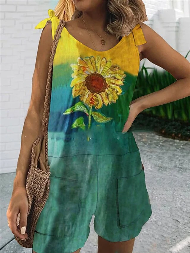 Women’s Romper Print Floral Crew Neck Holiday Street Daily Regular Fit Strap White Yellow Light Green S M L Summer