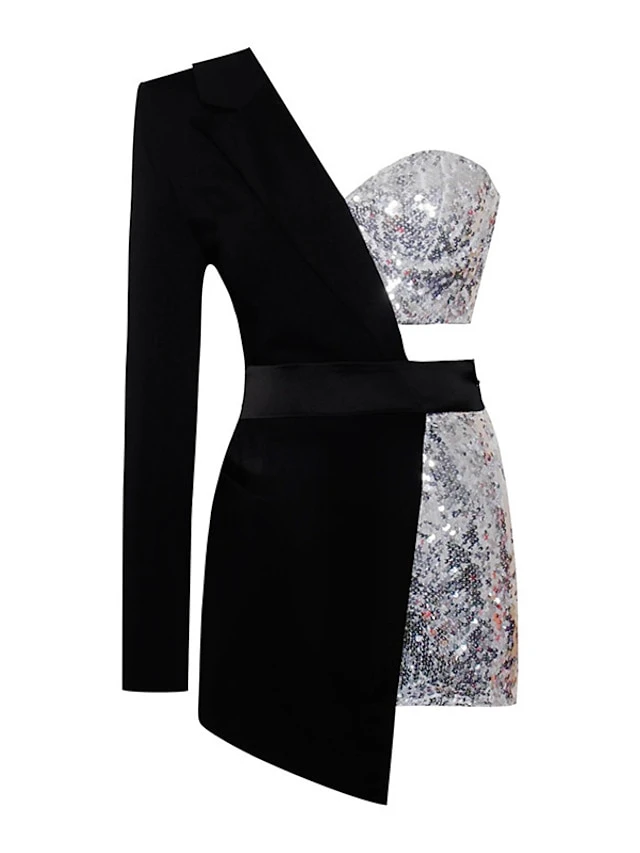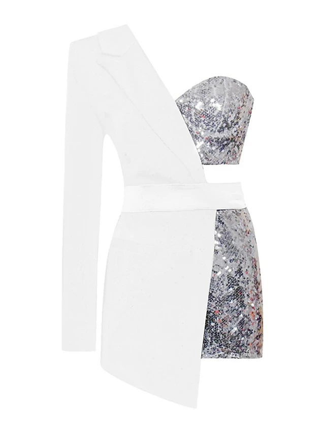 Women‘s Romper Sparkly Sequins Color Block One Shoulder Business Street Daily Wear Regular Fit Long Sleeve White Black S M L Fall