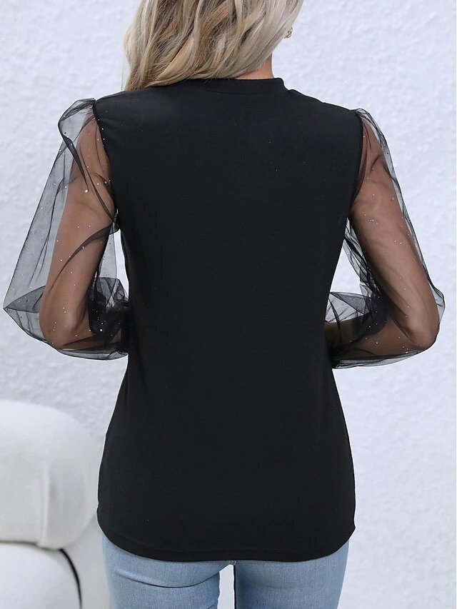Women’s Shirt Blouse Black Plain Mesh Patchwork Button Long Sleeve Casual Basic V Neck Regular Fit Spring &Fall