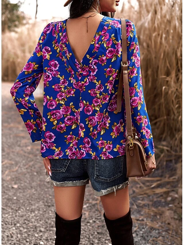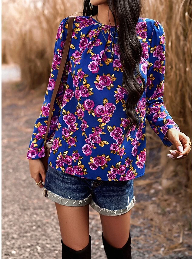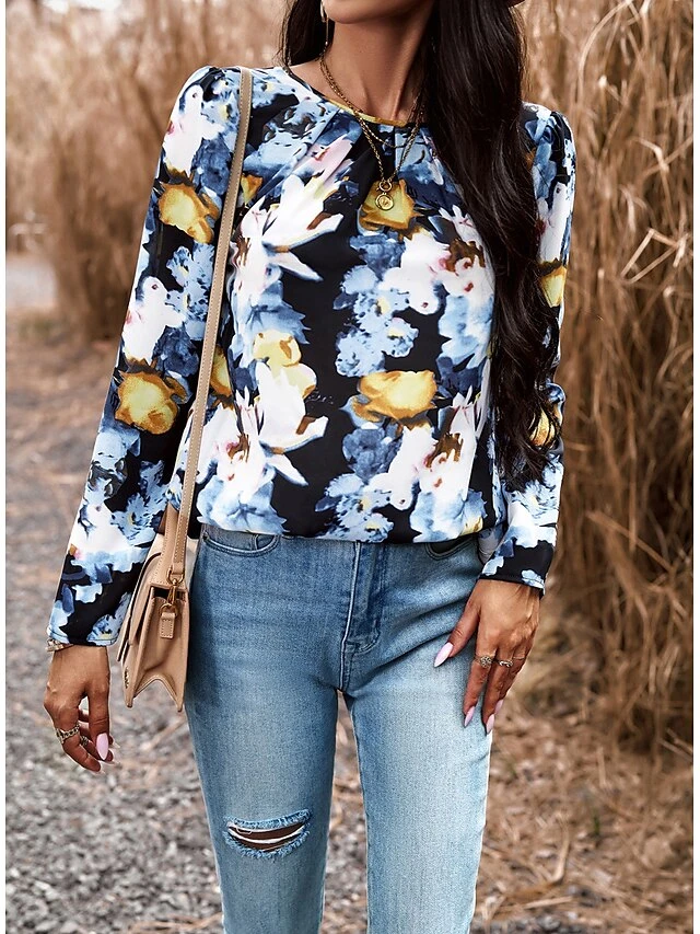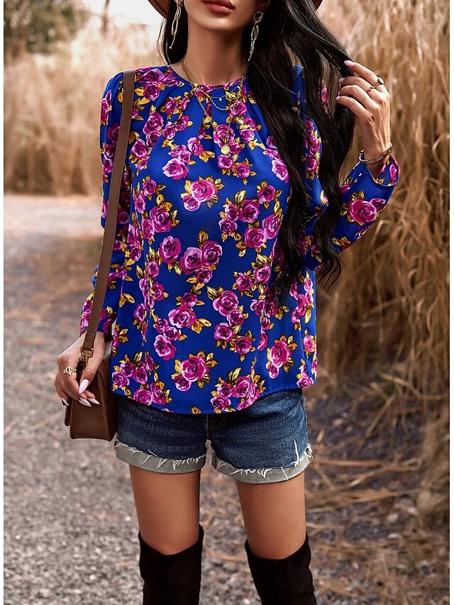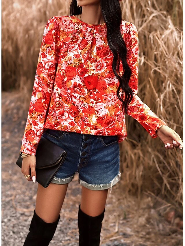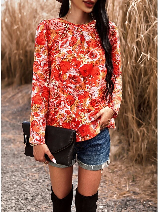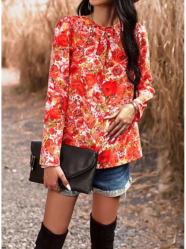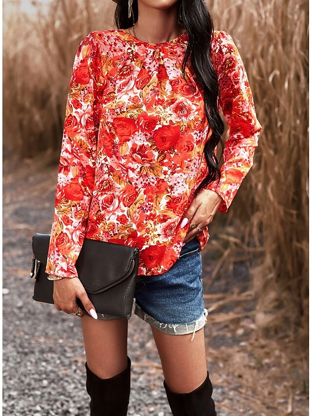 Women’s Shirt Blouse Black Red Blue Graphic Floral Print Long Sleeve Casual Holiday Fashion Round Neck Regular Fit Floral Spring &Fall