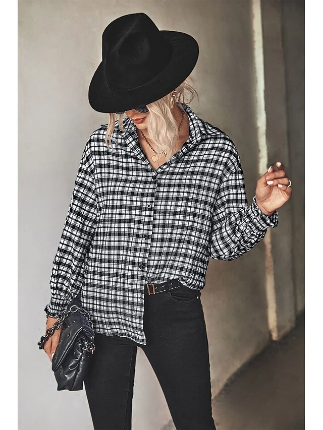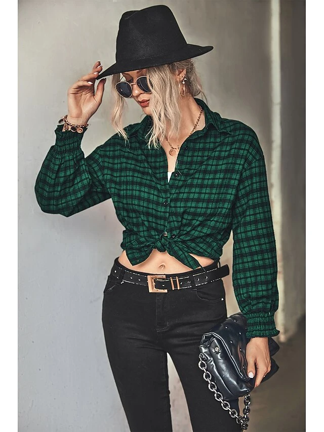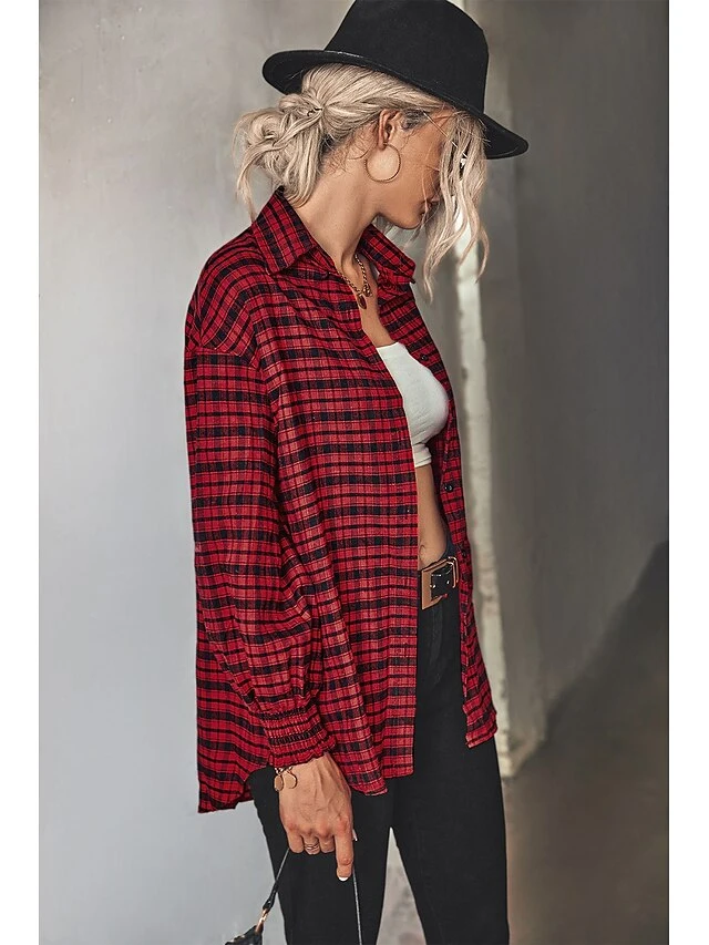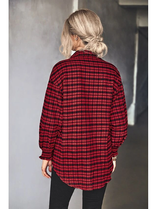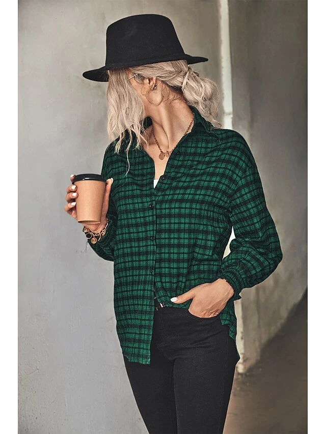 Women’s Shirt Blouse Black Red Green Plaid Button Print Long Sleeve Casual Fashion Shirt Collar Regular Fit Spring &Fall