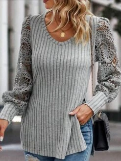 Women’s Shirt Blouse Gray Plain Lace Long Sleeve Casual Fashion Round Neck Regular Fit Fall & Winter