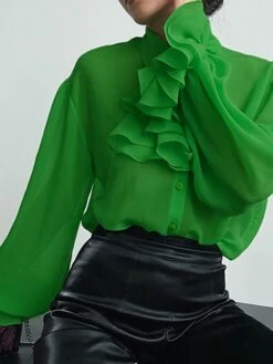 Women’s Shirt Blouse Green Plain Button Long Sleeve Casual Fashion Shirt Collar Regular Fit Petal Sleeve Spring &Fall