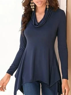 Women’s Shirt Blouse Navy Blue Plain Flowing Tunic Long Sleeve Casual Fashion V Neck Regular Fit Spring &Fall
