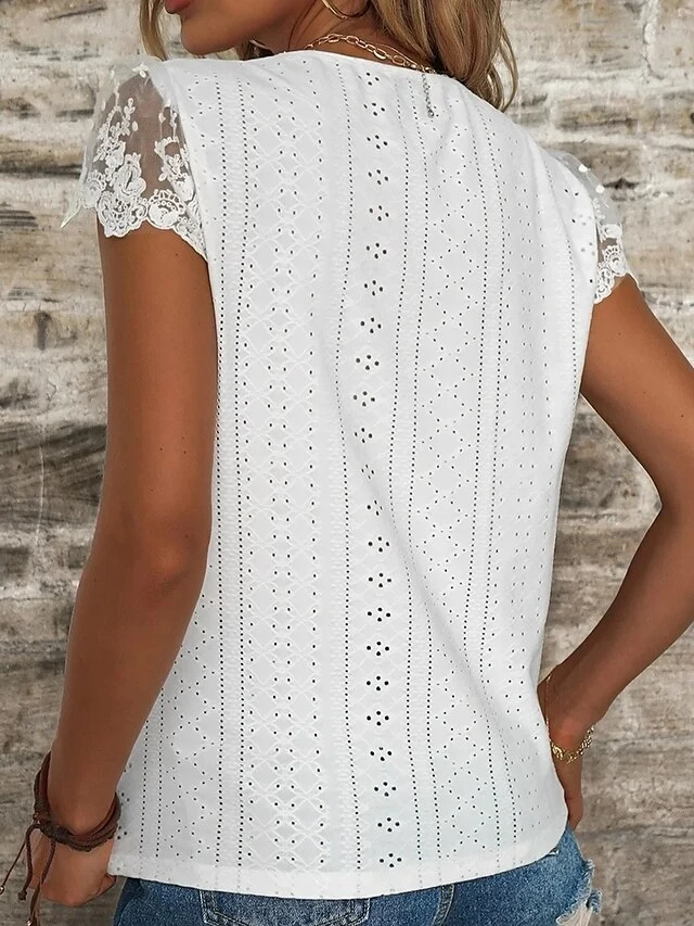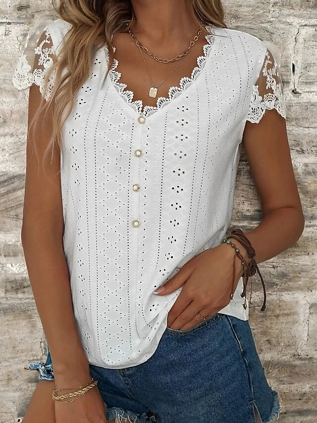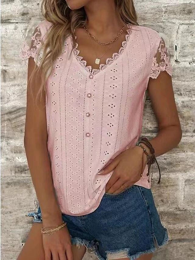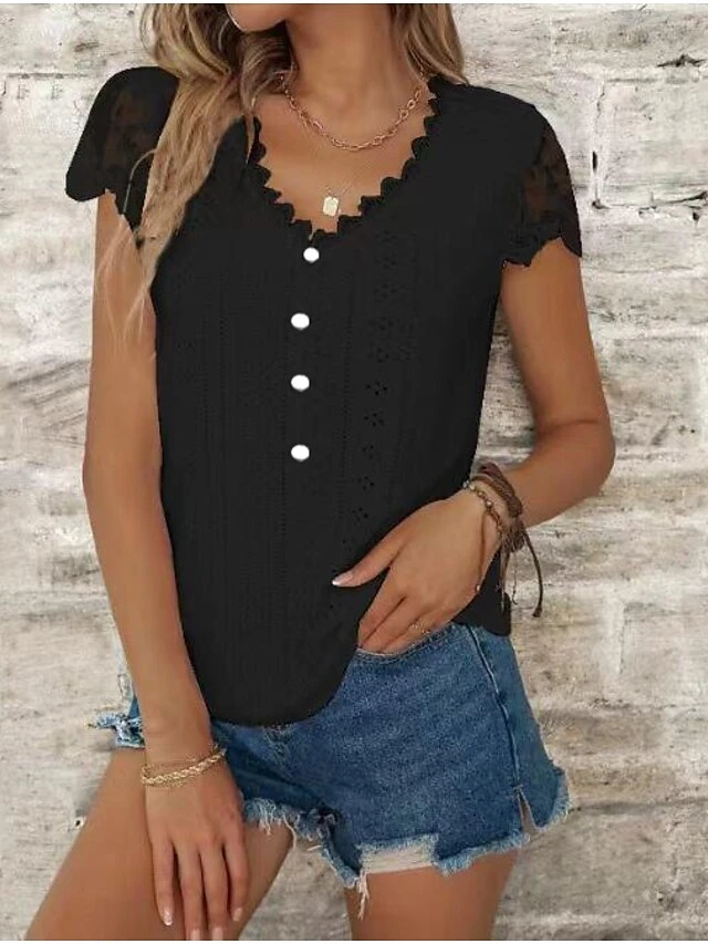 Women’s Shirt Blouse Pale Pinkish Gray Black White Plain Lace Button Short Sleeve Casual Basic V Neck Regular Fit
