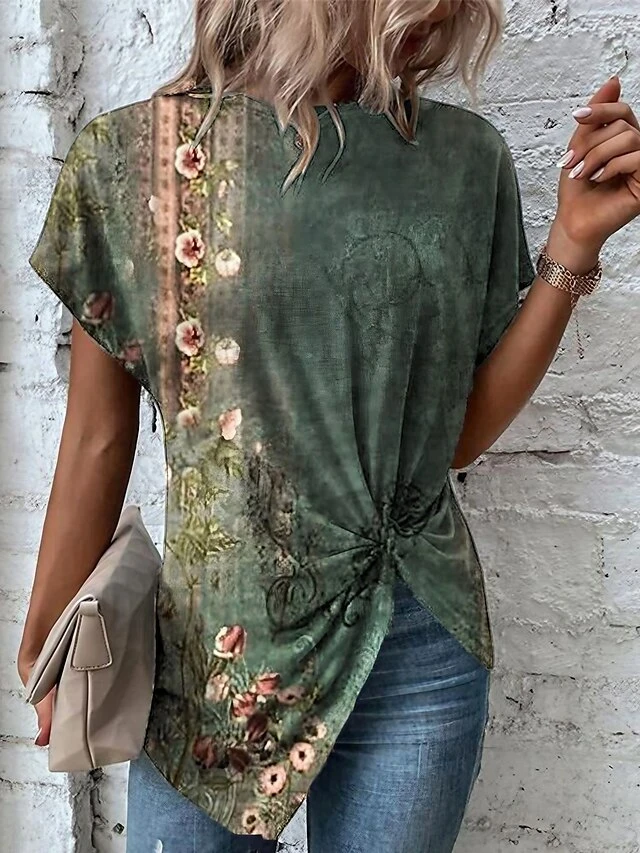 Women’s Shirt Blouse Red Green Graphic Floral Print Short Sleeve Casual Holiday Basic Round Neck Regular Fit Floral