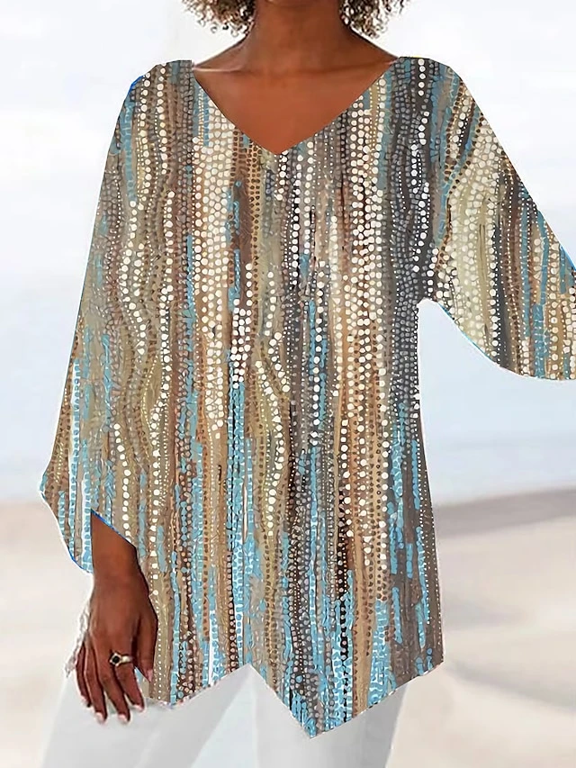 Women’s Shirt Blouse Silver Blue Sky Blue Graphic Asymmetric Print Long Sleeve Casual Basic V Neck Regular Fit Spring Fall